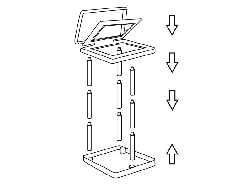 Een zeer stevige vuilniszakhouder. In de houder kan eenvoudig een vuilniszak worden bevestigd. Geschikt voor vrijwel iedere gangbare vuilniszak. Deze houder is volledig demontabel en daardoor makkelijk mee te nemen. Aan de onderkant bevinden zich uitschuifbare stabilisatoren voor extra stevigheid.