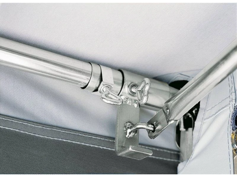 Een optimale pasvorm aan de voortent door middel van het speciale bevestigingssysteem onder de petluifel van de voortent. Het speciale luifelframe is voorzien van 3 bevestigingsbeugels die op het frame van de voortent worden gemonteerd. Deze bevestigingsbeugels kunnen universeel op zowel stalen als alumnium voortenframes worden gemonteerd in de buisdiameters 25 en 28. Voor 32 mm frames leveren wij een aangepaste bevestigingsbeugel.