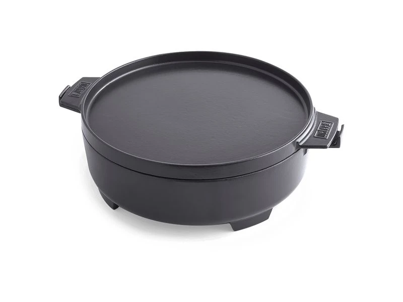 Dit veelzijdige kookgerei biedt eindeloze mogelijkheden voor op de barbecue. De gietijzeren Dutch Oven van 6,8 liter biedt een gelijkmatige warmteverdeling en -behoud voor malse braadstukken en smakelijke soepen en stoofschotels. Het deksel met dubbele functie kan worden gebruikt als platte bakplaat om broodjes te roosteren of kippenborst en groente perfect te garen. Dankzij de porselein-geëmailleerde finish is de Dutch Oven makkelijk schoon te maken en de twee onderdelen kunnen perfect op elkaar gestapeld worden voor plaatsbesparend opbergen.
